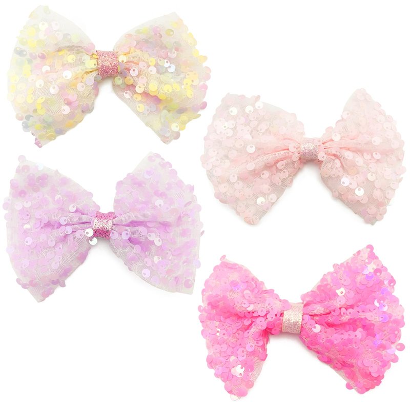 PRETTYLIFE Shiny Sequins Hair Bows for Girls, 4 Pieces Pink Style Glitter Mesh Alligator Hair Clips Accessories 4.7" for Kids Teens (Style-1)