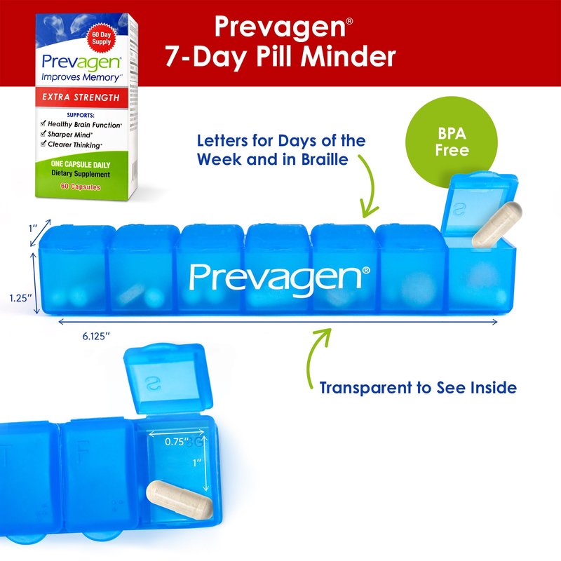 - Includes a Prevagen 7-day Pill Minder to help you stay organized. BPA free, letters & braille for days of the week