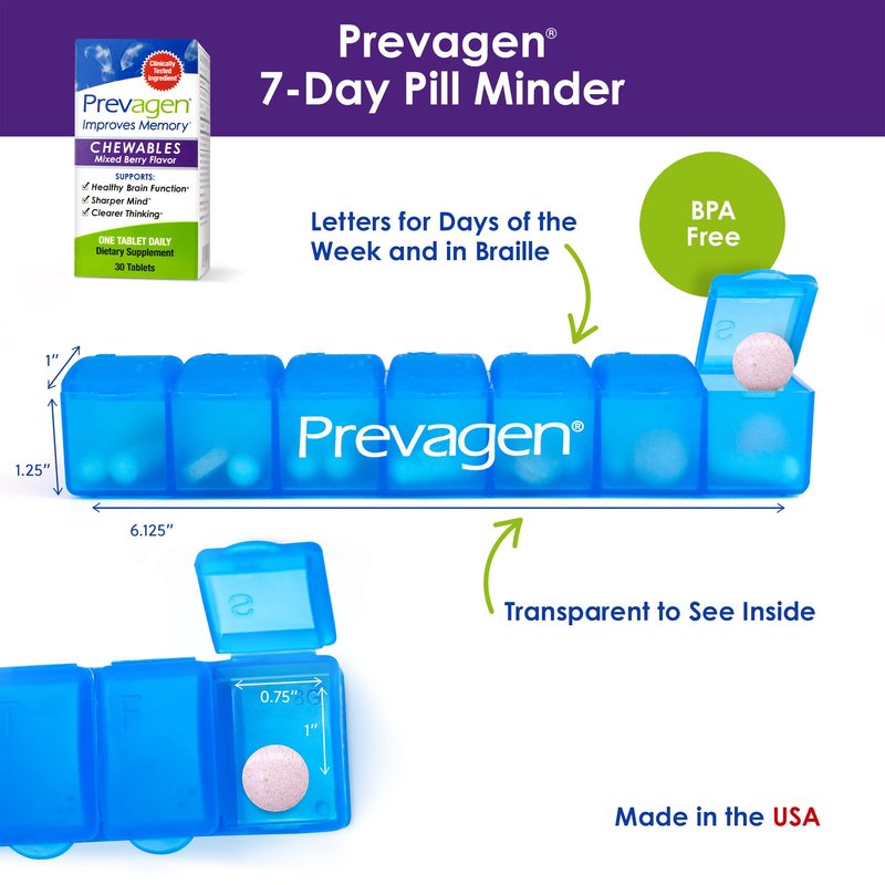 - Includes a Prevagen 7-day Pill Minder to help you stay organized. Made in the USA, BPA free, letters & braille for days of the week