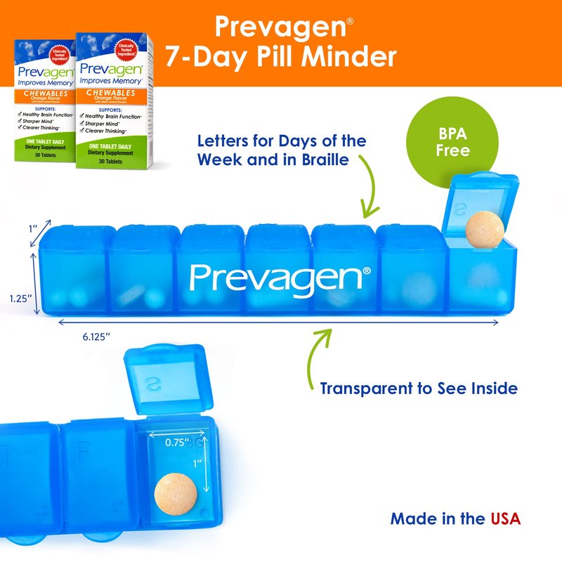 - Includes a Prevagen 7-day Pill Minder to help you stay organized. Made in the USA, BPA free, letters & braille for days of the week