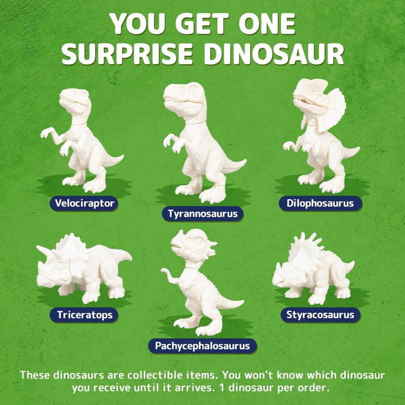 - EVERY KIT IS A SURPRISE - The fun part is that you don’t know what type of dinosaur you are going to get. These dinosaurs are collectible items. You won’t know which dinosaur you receive until it arrives. 1 dinosaur per order. Collect all 6 dinosaurs now!