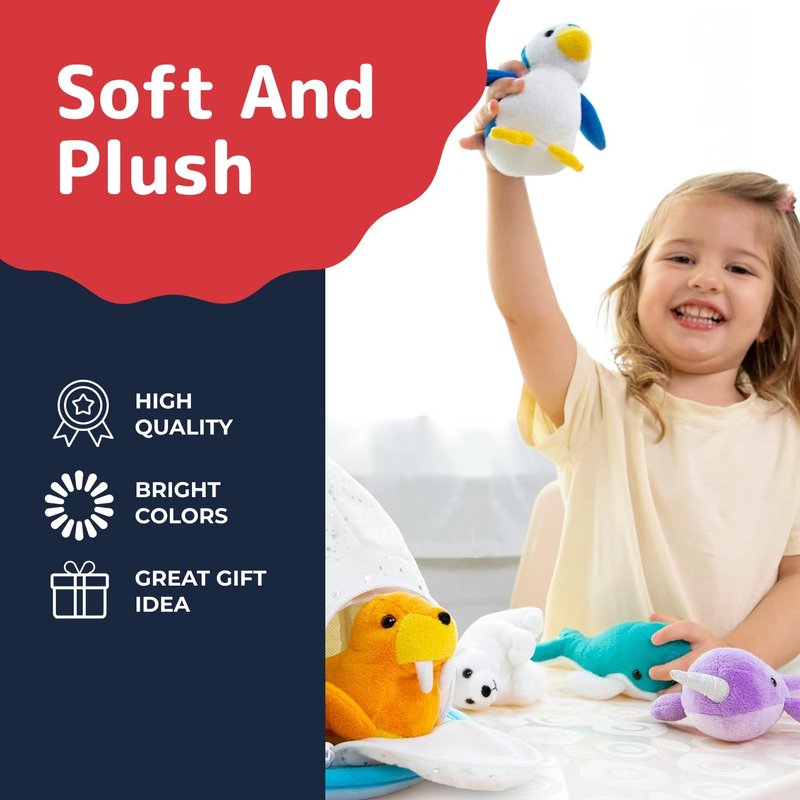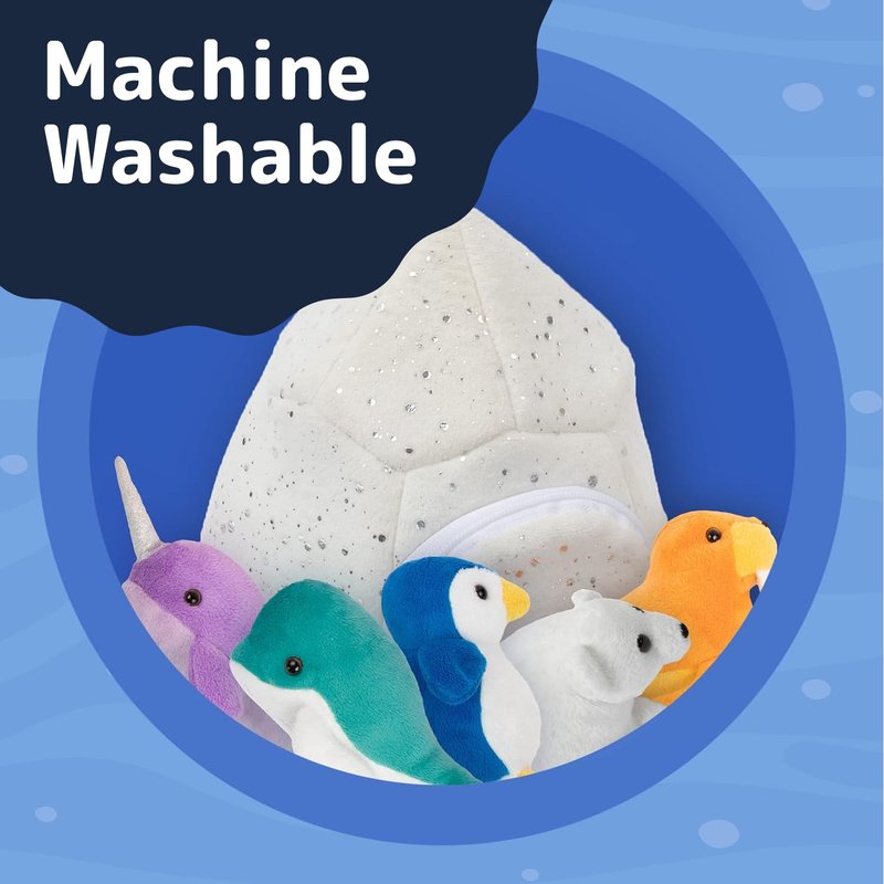 - INCLUDES - This set of stuffed animals with babies inside includes stuffed penguin, polar bear toy, whale, walrus, narwhal, and iceberg house with zipper and handle.