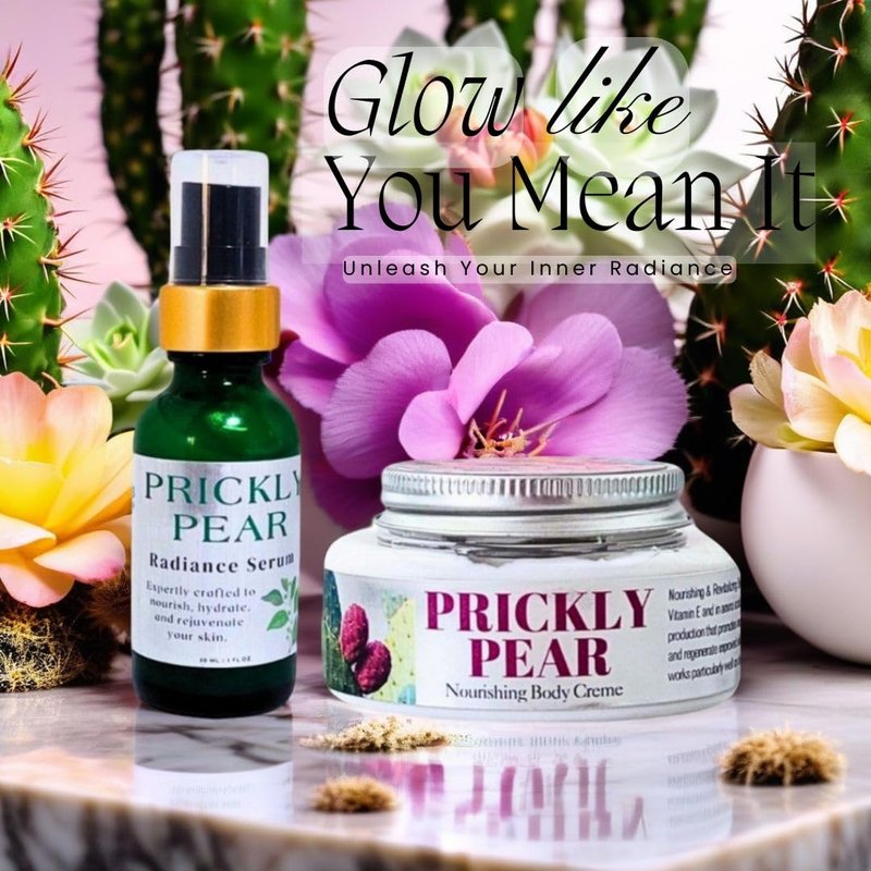 Indulge in the natural radiance of the Prickly Pear Glow Essentials Set. This luxurious duo combines a nourishing body creme and a radiance serum, expertly crafted to hydrate and rejuvenate your skin. The body creme is enriched with vegan ingredients that work in harmony to nourish and moisturize, leaving your skin feeling silky smooth. Complementing this, the radiance serum harnesses the power of prickly pear to infuse your complexion with a youthful glow. Embrace the pampering experience and let your skin bask in the revitalizing embrace of this indulgent set. Elevate your self-care routine with the Prickly Pear Glow Essentials Set.