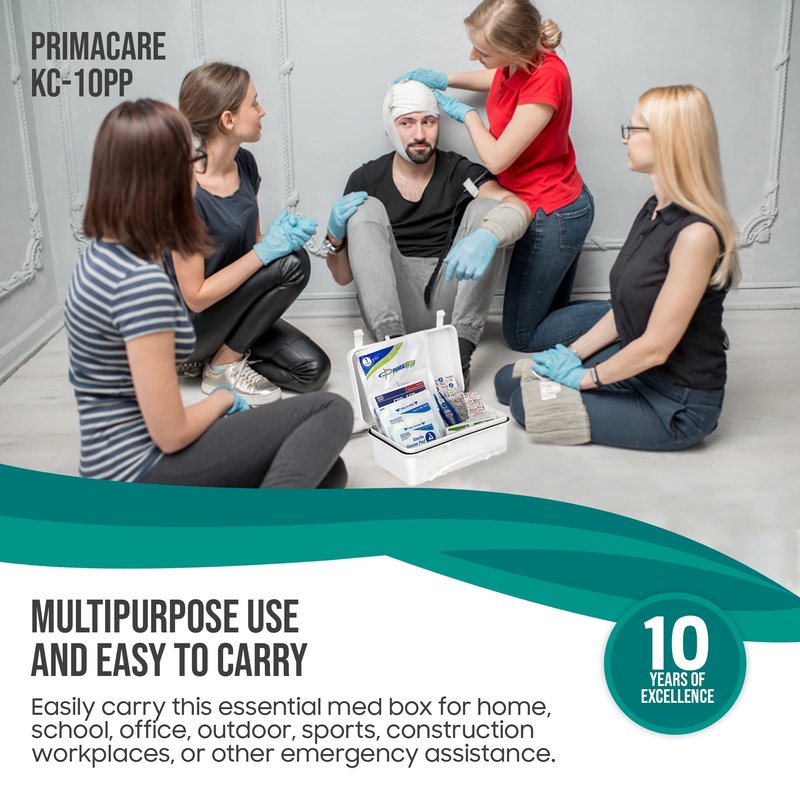 Primacare KC-10PP 10 Person Compact First Aid Kit, 8"x5"x3", with 102 Pieces Emergency Medical Supplies, Portable Kits for Home, School and Office, Wall Mount, White