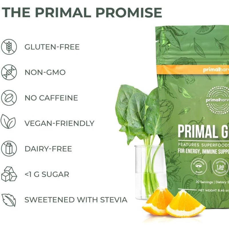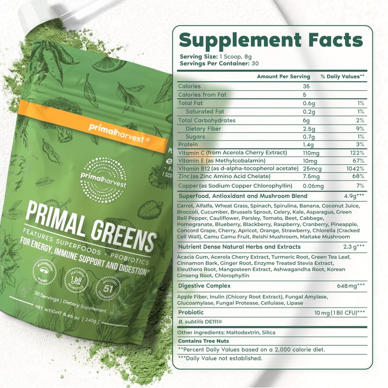 Designed to “Supercharge” Your Health, Naturally At Primal Harvest, we believe strongly that the main purpose of supplements is to fill in the gaps and make up for the inadequacies of our modern lifestyle and our modern diets. While we agree that pharmaceuticals have their place, we also believe that taking a holistic approach that treats the body as an integrated system, rather than a series of separate parts, can help restore balance and promote a natural state of wellness. Nutrition Overload with Primal Greens Packed with vitamins and minerals, Primal Greens helps support immune function and overall vitality, so you can do more and achieve more. Its probiotic content is designed to support gut health, mood, and metabolism. Plus concentrated nutrients, dark leafy greens, and adaptogenic mushrooms to help optimize energy production for a pure energy boost without the harmful effects of energy drinks. The Essential Immune Support Formula 50+ Fruits, Vegetables, Herbs and More Primal Greens is a powerful blend of whole foods goodness in just one easy scoop per day. It’s formulated with over 50 vegetables, fruits, mushrooms, and herbs fortified with chlorella, spirulina, and lactobacillus acidophilus probiotics for optimum absorption and detoxification. Serving Suggestions Stir 1 scoop into at least 8 oz hot or cold beverage, or add into your favorite smoothie mix. Drink once or twice daily, preferably in the morning, on an empty stomach or with a light meal. For best results, combine with balanced meals, exercise, water, and plenty of rest. Better Mood and Better Taste Primal Greens is designed to help clear brain fog, boost energy, immunity, and improve your mood by helping your body combat the effects of stress. All while enjoying your supercharged green juice, smoothie, or however you like it without the typical, grassy taste.