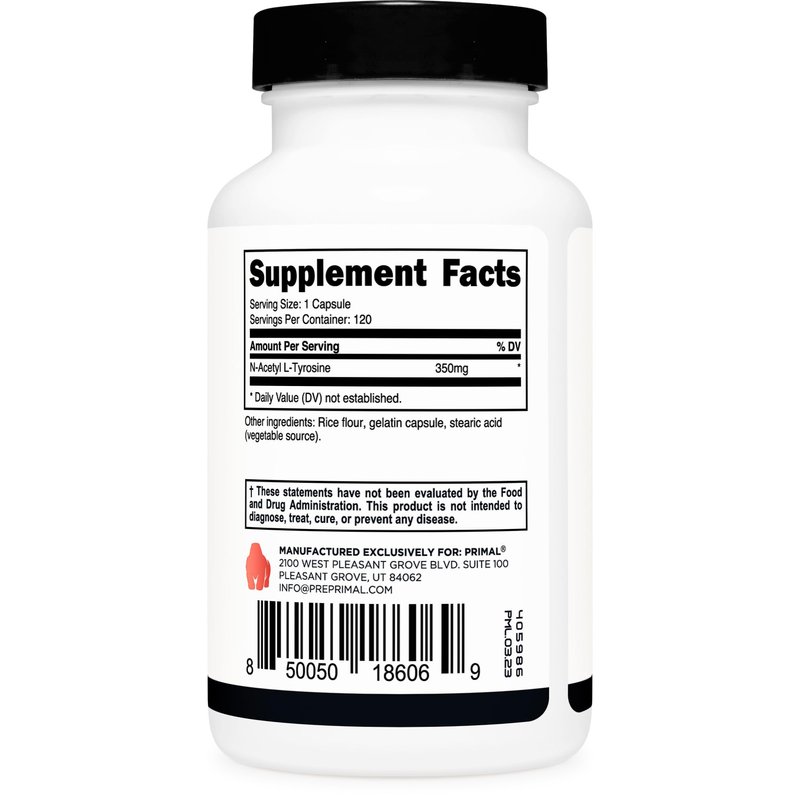 - Enhance mental focus and clarity: Primal N-Acetyl L-Tyrosine (NALT) Capsules provide 350 mg of N-Acetyl L-Tyrosine per serving, supporting cognitive function and helping you stay sharp and focused throughout the day.