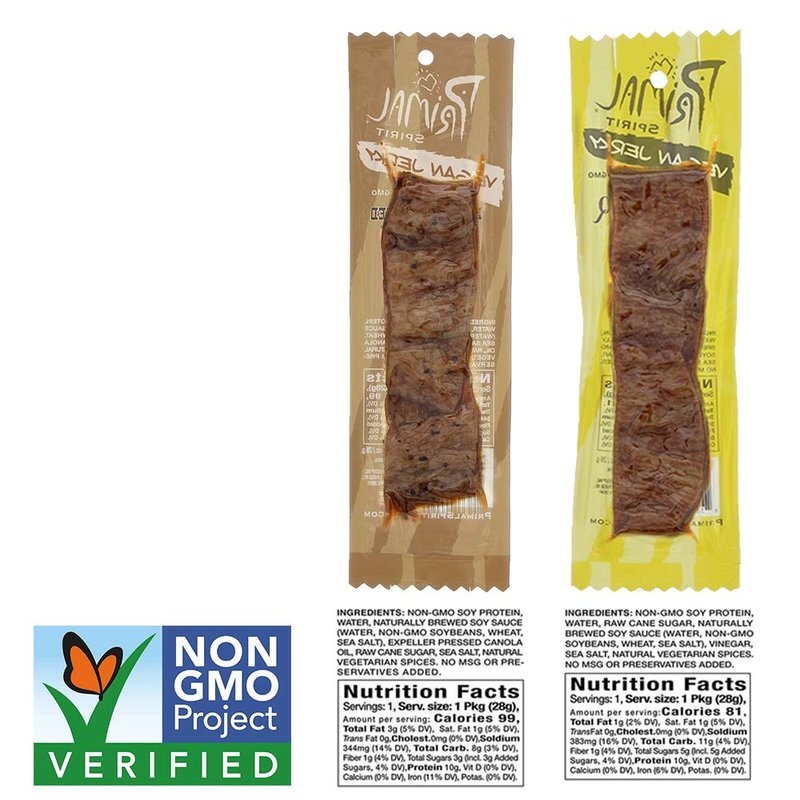 Primal Spirit Vegan Jerky - Soy Protein Energy Pack, 10 g. Plant Based Protein, Certified Non-GMO, No Preservatives, Sports Friendly Packaging The Classics Hickory Smoked and Texas BBQ...