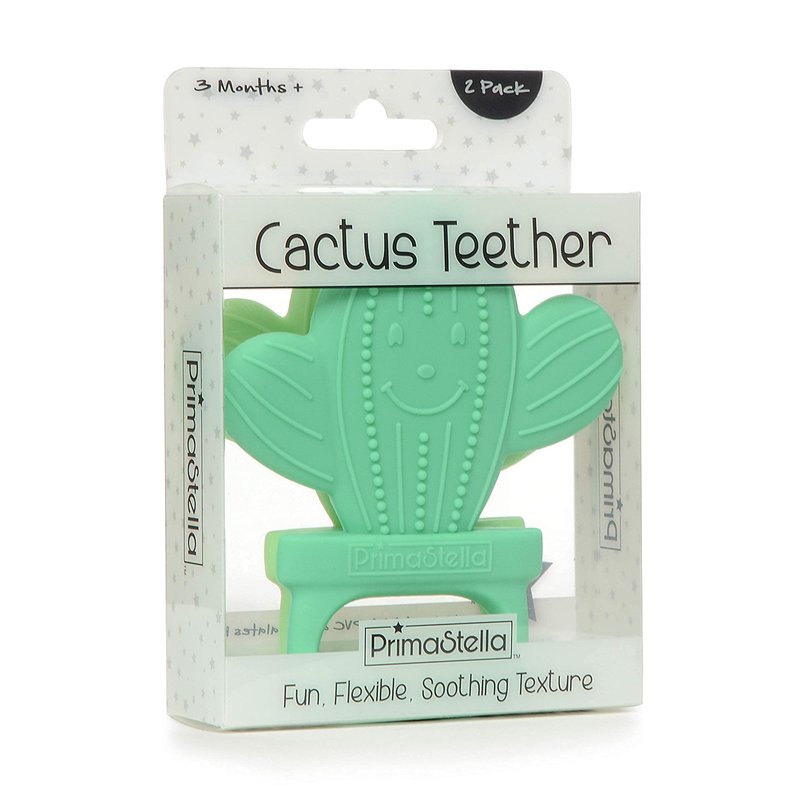 Help soothe sore gums with the fun, flexible, textured silicone the Happy Cactus Teether duo in Cactus Green & Neo Mint.