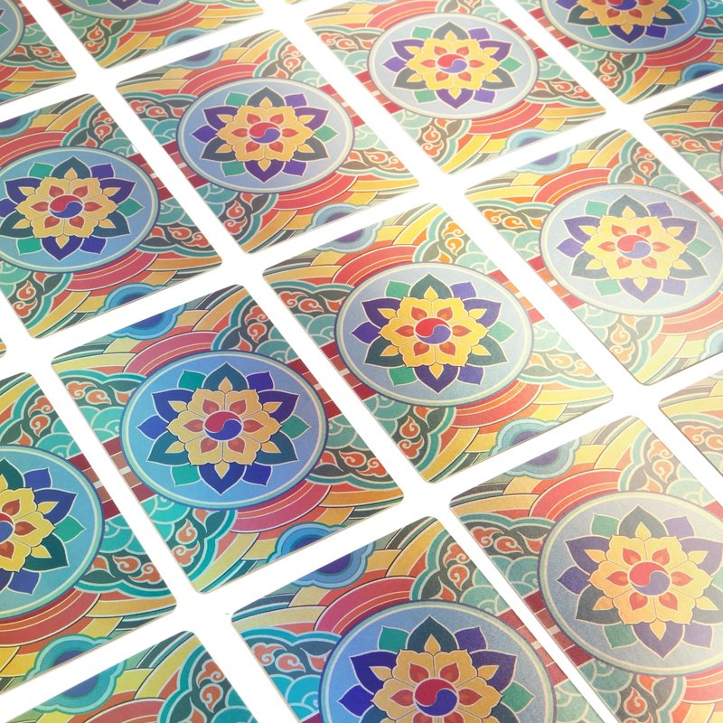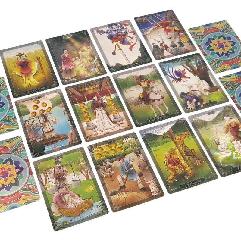- TAROT DECK SPEC ◆ There are 78 cards (2.91"x 4.4") which have 350gsm white core paper with matte varnish UV finish for more classy quality. The deck has matte gold edges. On the back of the cards, there are colorful holographic illustration of dancheong, Korean traditional paintwork on wooden building. A 230-page of Korean and English guidebook is also included in the magnetic flip box with the deck.