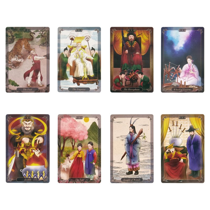 - VARIOUS STORIES ◆ The minor arcana of Manshin2 tarot cards is composed of four tales of different gods. The cup cards are about Princess Bari, Jacheongbi story in the wand cards, story of General Choe Yeong for the sword cards, and the pentacle cards are the story of Woongnyeo. While carefully studying the order of the cards and the characters in the court cards, you can understand the characteristics of the gods in Korean folk tales and the flow of the stories, and will be able to get more accurate result.
