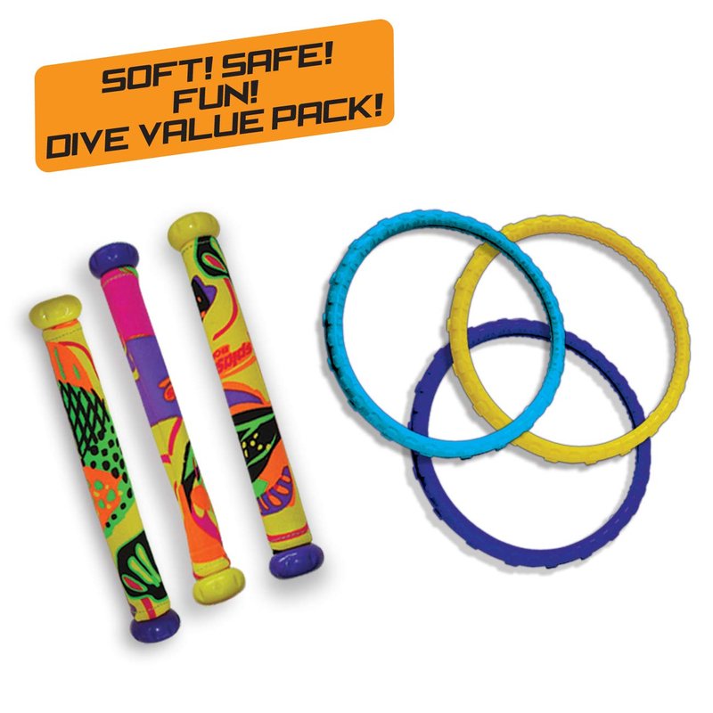 - Includes 3 Dizzy Dive Rings in assorted colors and 3 multicolored Dizzy Dive Sticks