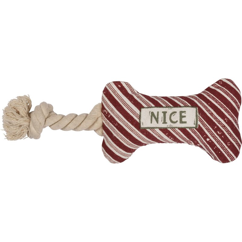 A double-sided cotton dog toy with attached rope element. Features a candy stripe design on both sides with "Nice" sentiment on one side and "Naughty" sentiment on other side. Makes crinkle sound. "OUR INSPIRATION We’re constantly inspired by the people, places and things around us. Kathy travels the world to pull inspiration first hand from cultures around the globe. We create product that is ahead-of-the trend, uniquely designed and constantly evolving. We embrace the unexpected, set the trends and challenge ourselves to create décor and gifts that are memorable and one-of-a-kind. We believe that a combination of the perfect sentiment and fresh design never goes out of style. Our promise is to create the designs that you love – with the expertise and product mix you desire. We’re inspired by you, our loyal customers, to bring the best products to market for you to enjoy."