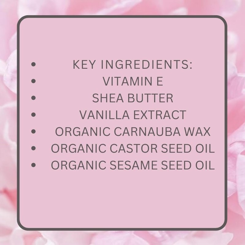 - Key Ingredients: Vitamin E, Shea Butter, Vanilla Extract, Organic Carnauba Wax, Organic Castor Seed Oil, and Organic Sesame Seed Oil.