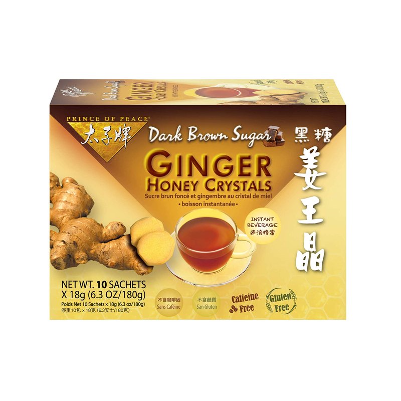 - GINGER + HONEY. Prince of Peace brings you all the natural, stomach-soothing benefits of ginger and honey in our special proprietary blend of Instant Dark Brown Sugar Ginger Honey Crystals. Each sachet contains concentrated extract from 14 grams of raw ginger, which is the base for the appealing aroma and exquisitely smooth taste.