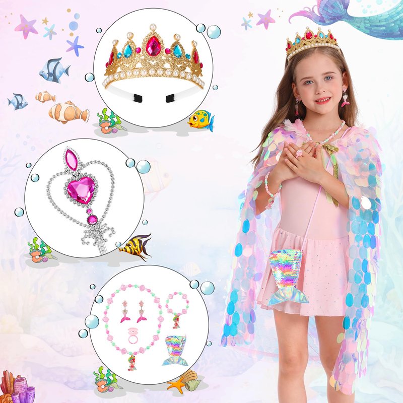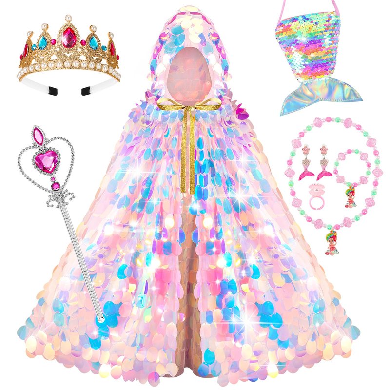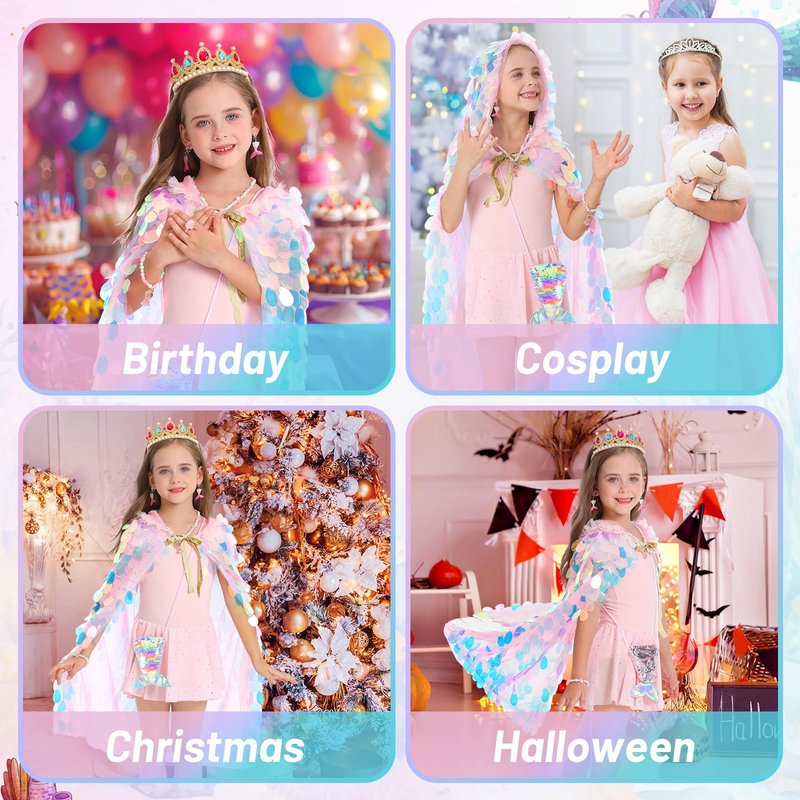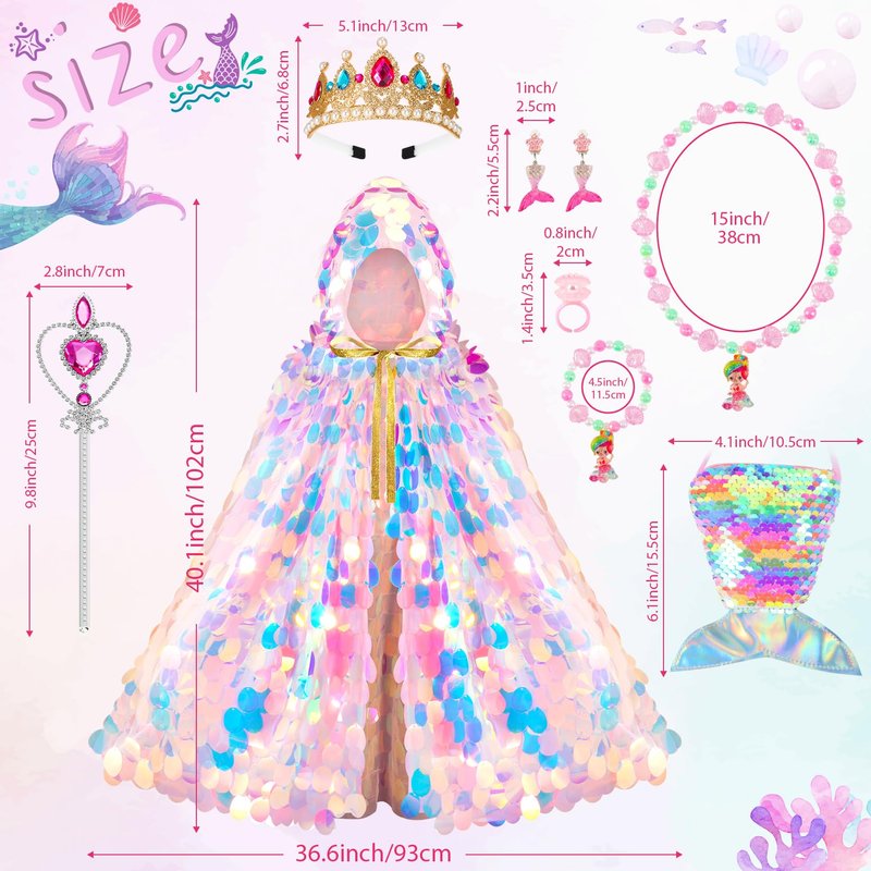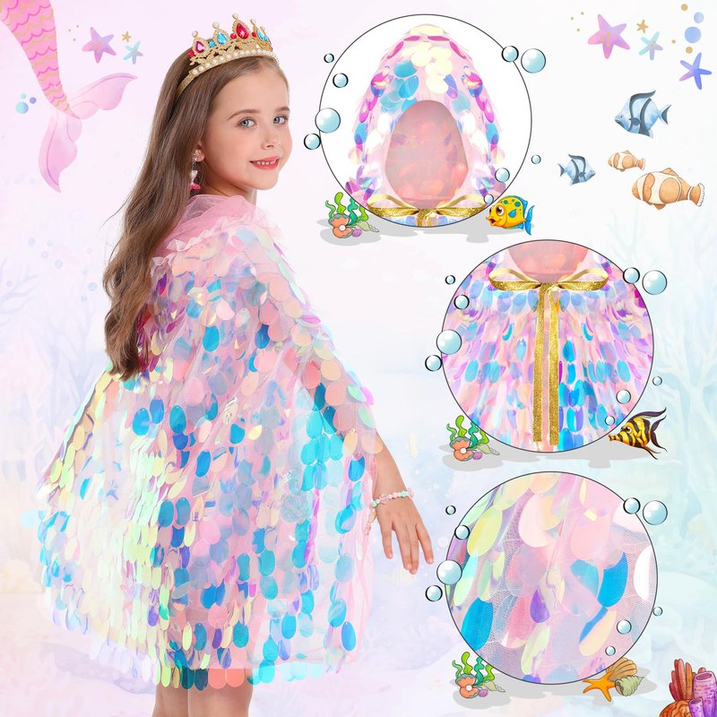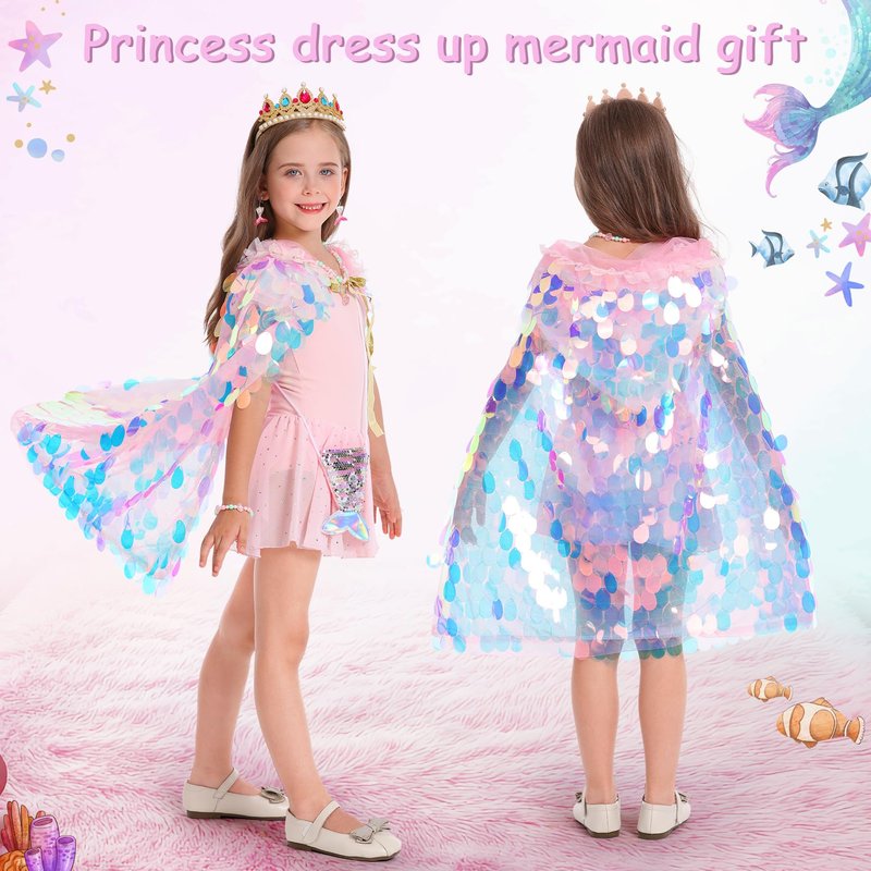 - 💯 Improve and develop kid's abilities: Every girl has a princess dream loves to dress up,especially dress up to be a princess. The mermaid princess cloak could easy help your girl princess dream come true. Princess cloak set encouraging role-play and storytelling,inspires little girls' self-confidence, creativity, imagination and interpersonal skills.