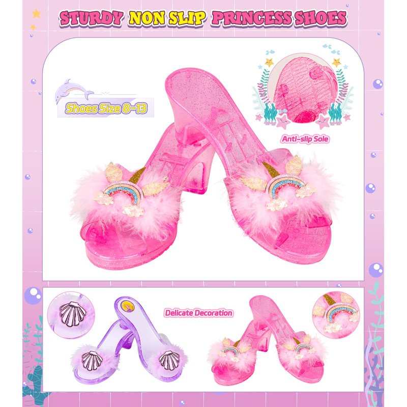 • Sturdy Princess Shoes, Non-slip Upgrade: Soles of girls dress up shoes have non-slip protruding mini round gel design, great grippy on bottom, so don't need to worry your girl slide out on tile/wood floors. Heel-height 1.97inch, ideal for little girls. Princess shoes size 8-13, with room to grow. Sparkling Shells and rainbow dotted on shoes, so special. Feathery parts add a light and agile feeling