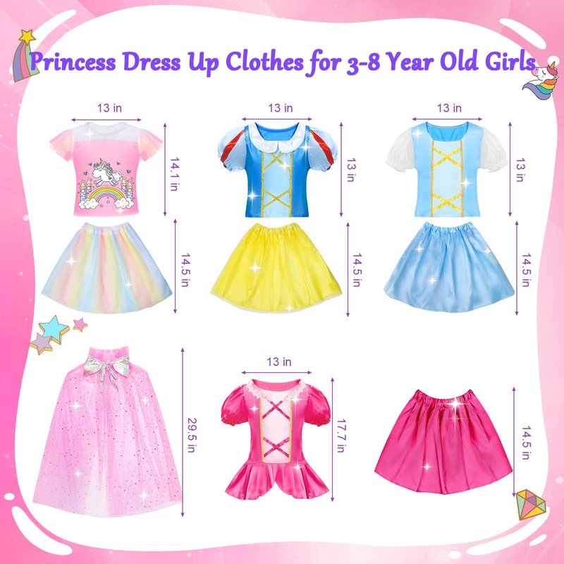 - Princess Dress Up Clothes for 3-8 Year Old Girls - Princess dresses with stretchy elastic waistbands offer the utmost comfort for girls aged 3-8 years old. The waistbands of these adorable skirts can stretch from 7 to 15 inches, making them suitable for most girls in the 3-8 age range. Our princess dress up set features a variety of designs, allowing your little one to explore her fashion sense and transform into a different princess character every day.