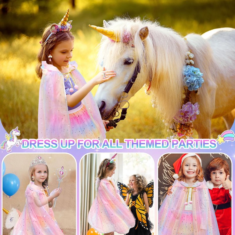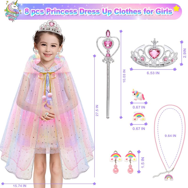 - Princess Dress Up for Girls 4-6: If your girl love dress up games,princess costume for girls will meets their imagination and curiosity. Girls dress up clothes for play with everything need to be a princess! Princess toys for 3 year old girls is equipped with rainbow princess cape, princess crown tiaras for girls,necklace,rings*2,rainbow ear clips*2 and essential princess wand. Must-have princess dress up girls toys age 6-8 for every little girl in kids' dress up&pretend play