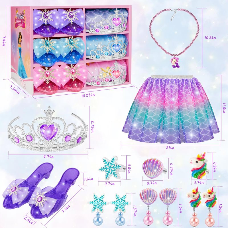 - 【Best Princess Dress Gift Toys】The jewelry dress-up accessories toy play set for girls is perfect for satisfying your little girl's fantasy of being a princess. This role-play game is ideal for girls aged 3-7 years and is perfect for girls' parties, dress-up parties, birthday gifts, Halloween gifts, Christmas gifts, and family activities.