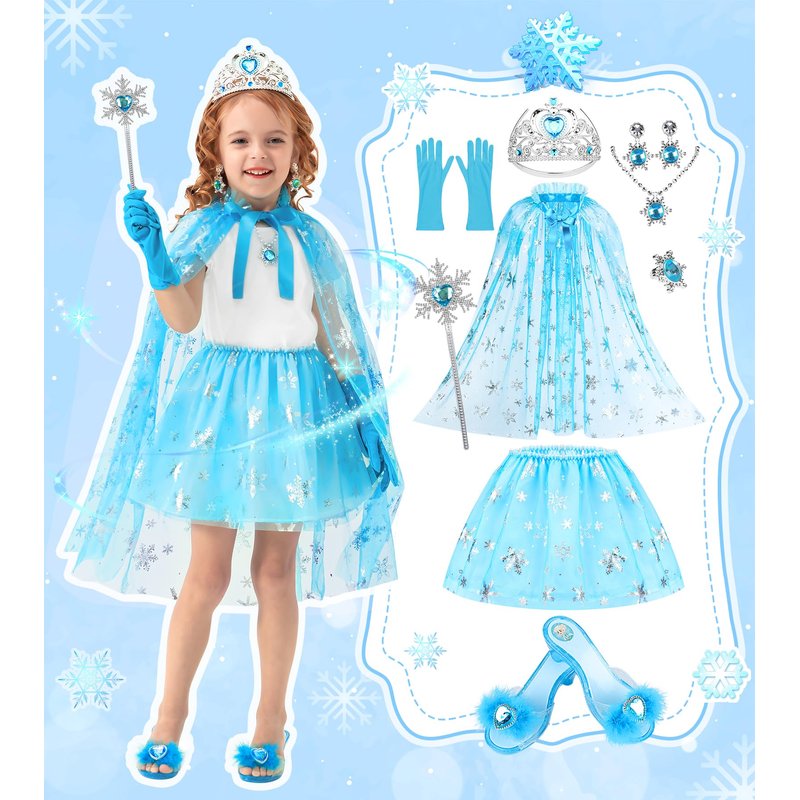 - Transform Ordinary Days into Fairy-Tale Adventures: This princess set is the icing on the cake to add more charm to the princess.The elastic waistband princess skirts have a polyester lining and an outer layer of tulle which is covered by snowflakes, moon, stars patterned glitters, blue and colorful cloaks with shiney sequins stars and moons capes are made from soft and comfortable gauze fabric.The long gloves, bejeweled crowns and magic wands, complete the princess look!