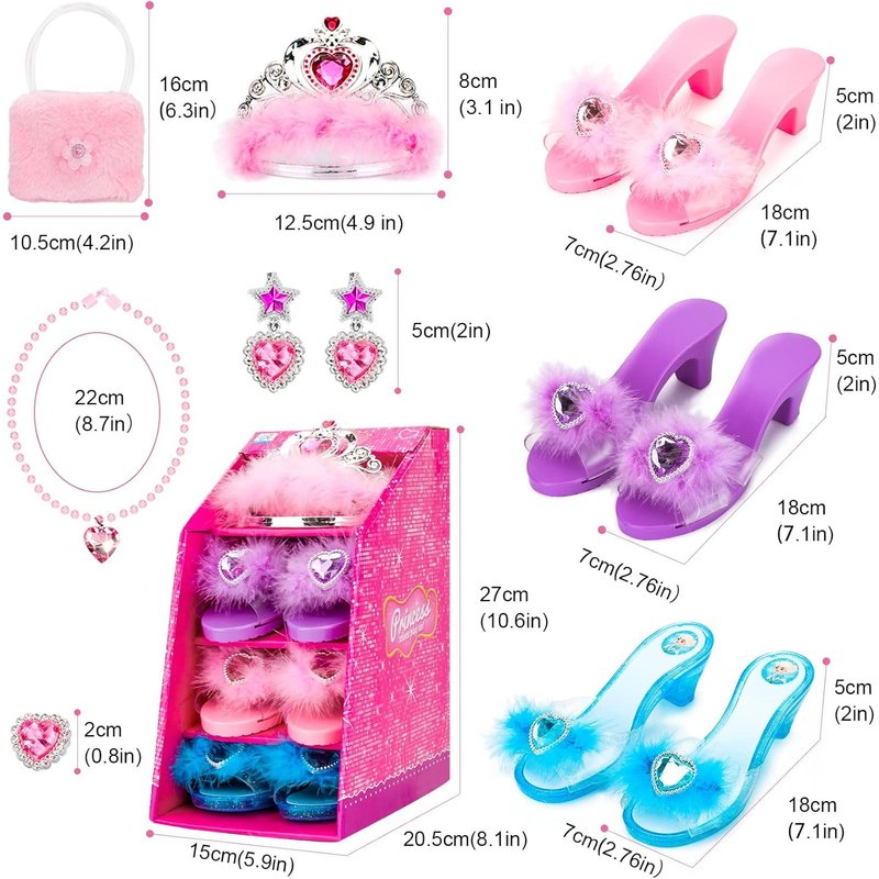 - Attractive Princess Banquet Role Play Set: Comes with a cute pink handbag and exquisite jewelry boutique accessories included 1 Crowns, 1 Necklaces, 2 Earrings,1 Rings, 3 Pairs of fairy Princess Shoes