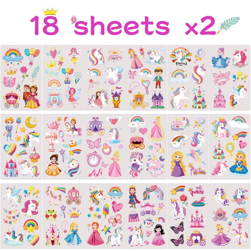Princess Temporary Tattoo for Kids, 270+ Pcs One-horned creature Rainbow Crown Fake Tattoos for Girls’ Party Supplies Kids' Birthday Favor, 36 Sheets Waterproof Tattoos for 5 6 7 8 9 Years Old Girls
