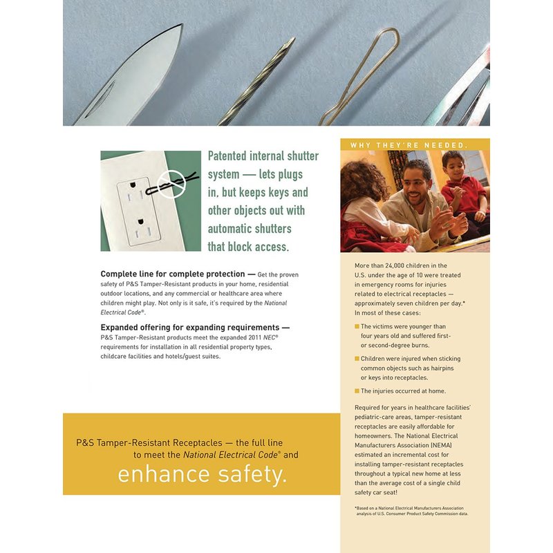 - Electrical Outlet: Legrand Pass & Seymour brand Decorator Tamper-Resistant Receptacle with high-impact resistant thermoplastic construction meets 2008 National Electrical Code Tamper-Resistant requirements. It protects children with a patented shutter system that helps prevent improper insertion of foreign objects. It has superior protection than traditional outlet caps or protection plates. Rated 15A - 125V