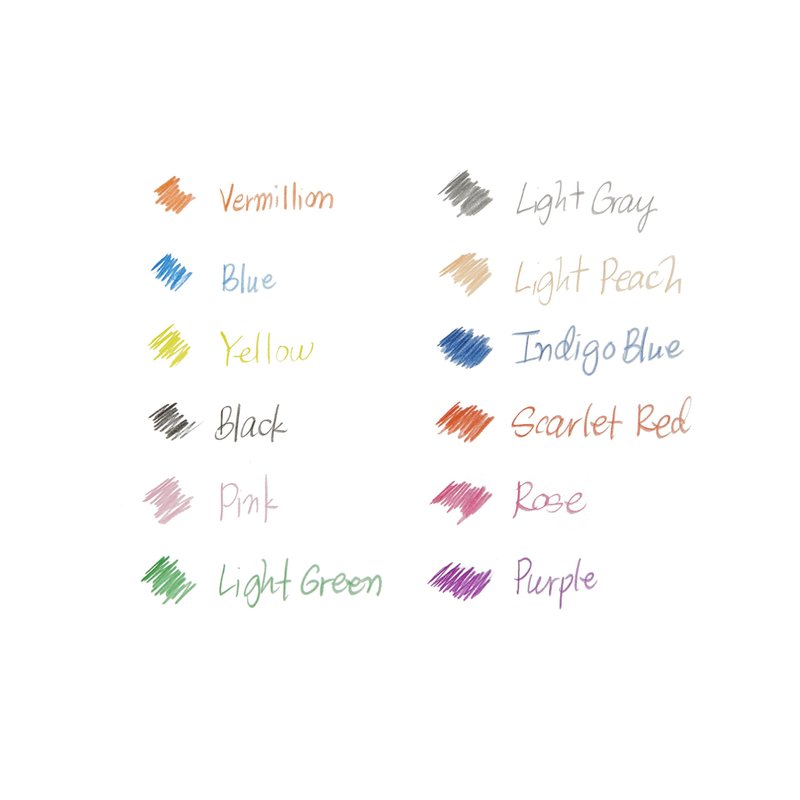- Includes: Vermillion, Brown, Terra Cotta, Tuscan Red, Blue, Carmine Red, Green, Yellow, Black, Purple, Light Blue, Light Green, White, Light Peach, Pink, Violet, Light Grey, Indigo Blue, Grass Green, Lavender, Canary Yellow, Orange, Rose and Red