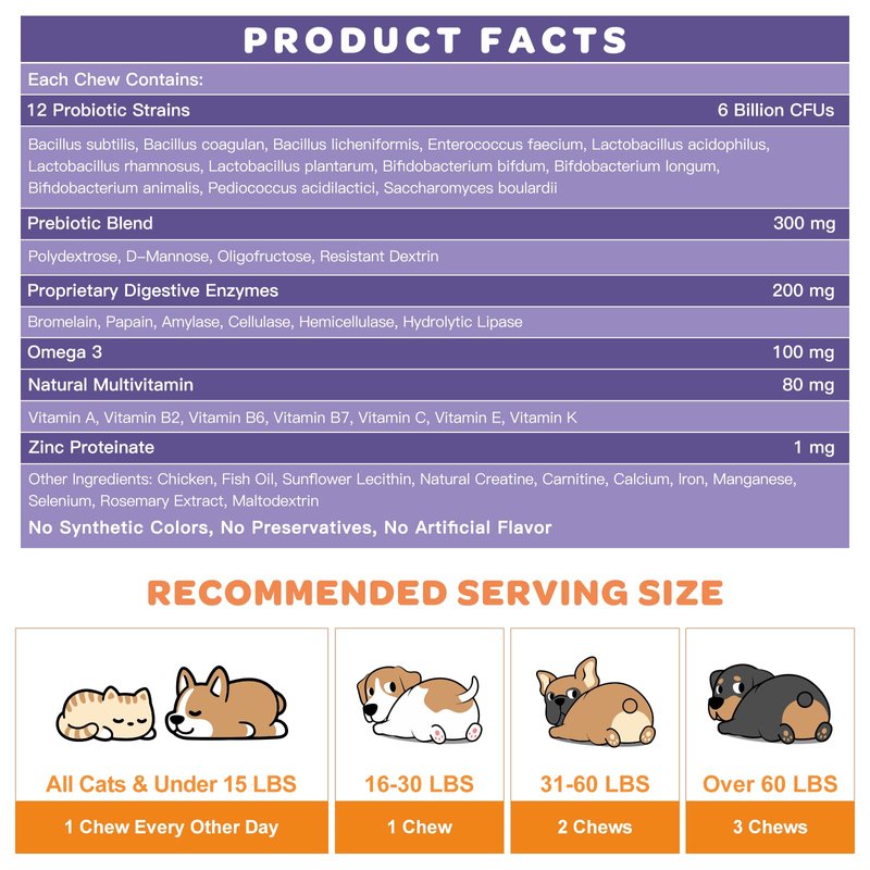 - Support Digestive and Gut Health: Our dog probiotic contain 6 billion CFUs and 12 strains of flora that support your pet's tummy. The main soil-based probiotic blend is especially resistant to stomach acid and bile. We also add prebiotics that helps nourish the growth of probiotics. And digestive enzymes can break down food and promote nutrient absorption. It helps relieve bad breath, bloating, diarrhea, constipation and vomit, and help form stools and support sensitive stomach for your pet.