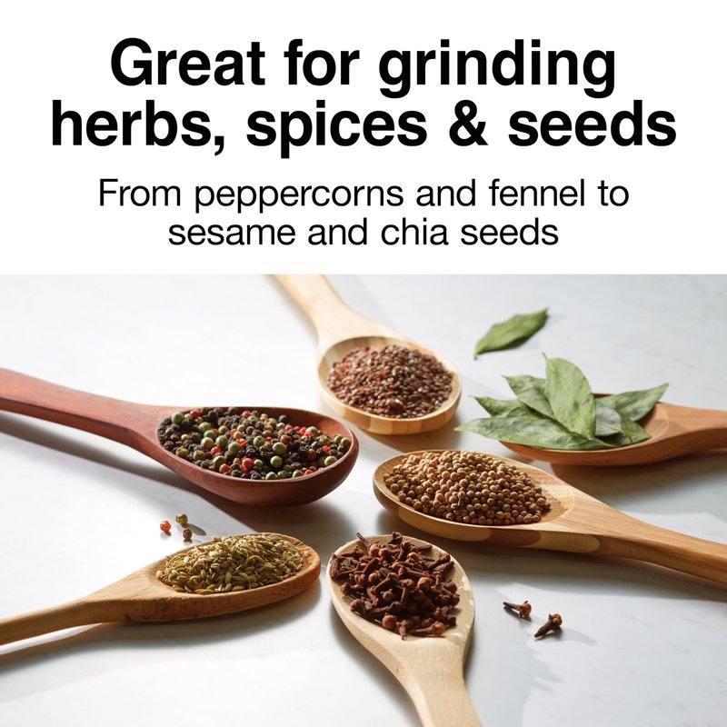 - GREAT FOR GRINDING HERBS & SPICES: Conveniently grind peppercorns, fennel and other herbs and spices for recipes or to keep on hand in the kitchen. Also great for grinding sesame, flax, chia and other seeds for smoothies, protein shakes or to add to food.