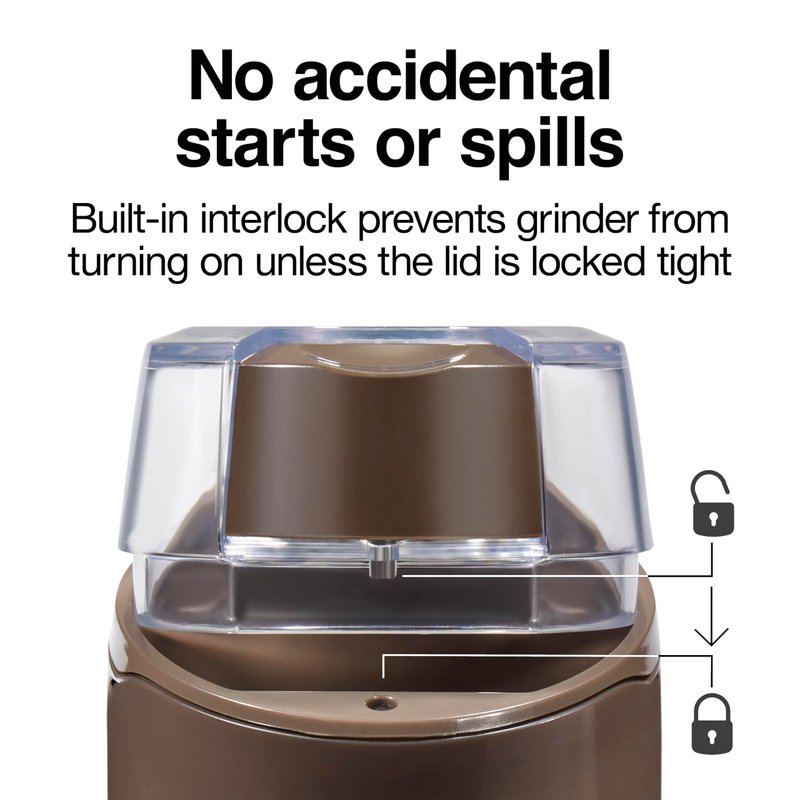 - NO ACCIDENTAL STARTS OR SPILLS: The built-in interlock prevents the coffee bean grinder from turning on when the safety on/off button is pressed unless the lid is locked securely in place.