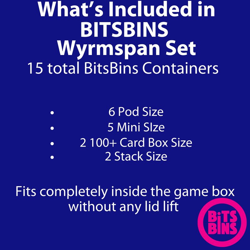 - Set includes: 15 Total BitsBins containers ~ 6 Pods, 5 Minis, 2 100+ Card Boxes, 2 Stacks. Game pieces, cards and game pictured are NOT INCLUDED