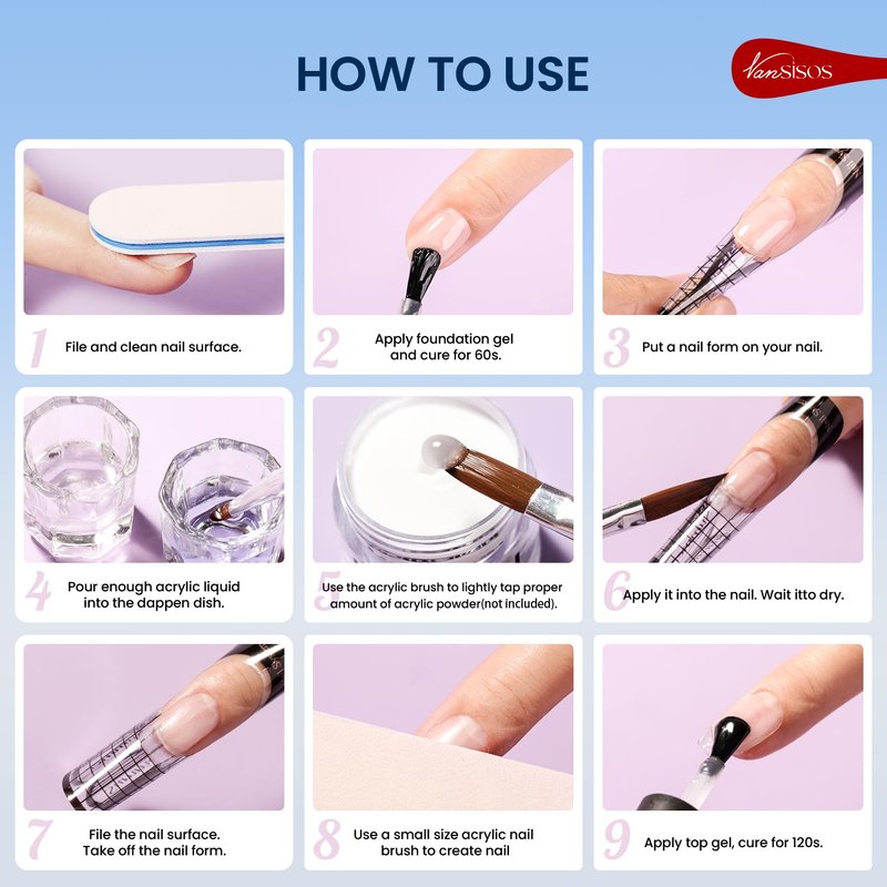 - 💜ADVANCED EMA TECHNOLOGY: VANSISOS Professional Acrylic liquid is MMA-free and is made by EMA and approved for sale. Traditional acrylic liquids contain MMA, which is smelly and harmful to the human body for a long time. Our acrylic liquid is MMA-free, has a low irritating odor and is harmless to the human body, and is recommended for use in a ventilated environment.