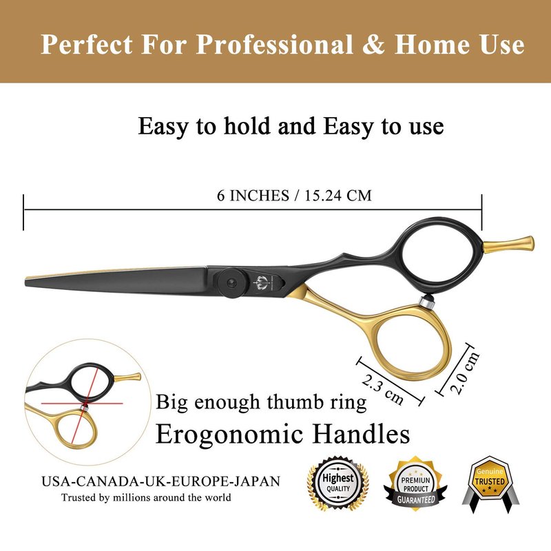 - BEAUTIFUL APPEARANCE -- Abrasion-resistant hard black and gold titanium coating blades are more than elegant and afford protection for those with nickel allergy. Razor edge hair cutting scissor is great for salon workers, barbers, and personal usage as well. It is safe and easy to use for men, women, the elderly, kids and babies.