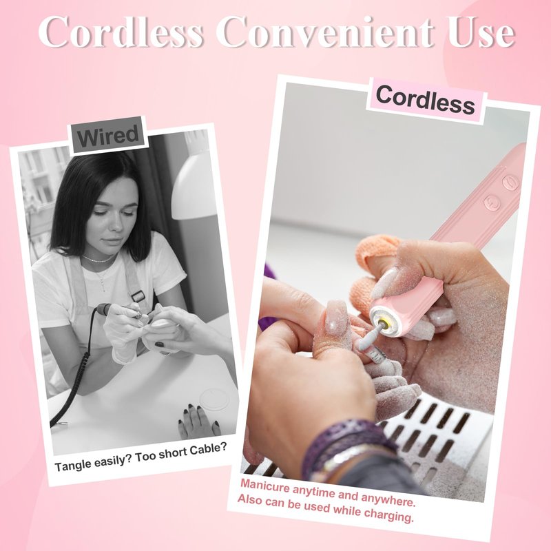 - Cordless Electric Nail Drill: Old-fashioned nail drill have the disadvantages of being large in size, heavy in weight, and with short wires, making them inconvenient to carry and operate. The latest cordless design allows you to completely get rid of the shackles of wires and make your operation more flexible. This nail drill does all the work with just 2 buttons.Compact and lightweight design make it easy to carry,your can file your nail anytime anywhere.