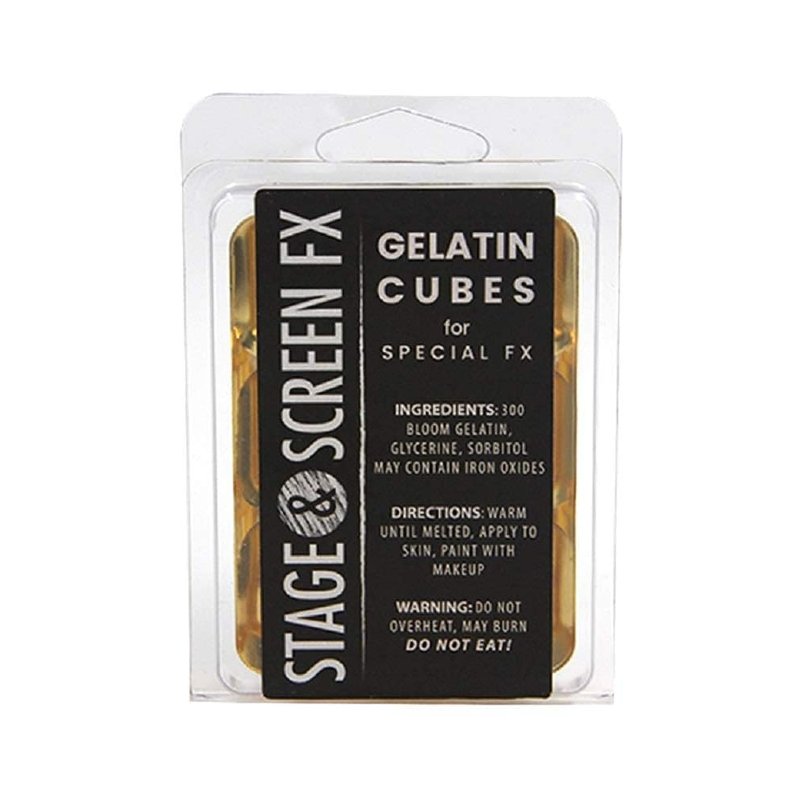 Professional F/X Gelatin Cubes approx. 4 oz *Create realistic wounds, scars and skin effects in minutes! No need to add anything to this product, just heat, apply and go! Made with professional fx grade 300 bloom gelatin, these gelatin cubes are widely used in the fx industry for creating realistic quick wounds and prosthetics. Simply warm until melted, apply to skin and paint with makeup. Gelatin can be warmed in a microwave (short intervals of 10 seconds is advised) or by submerging a container with gelatin cubes, into boiling water. Do not put cubes directly in water or they will dissolve. Always test temperature first. Can be re-used and re-melted. Cubes can also be melted than tinted with a small amount of cream makeup, liquid makeup or acrylic paint. Dries glossy. If a glossy look is not what the makeup calls for, just apply powder and seal with a makeup sealer. Not intended for human consumption. Removes easily with warm water and soap. Simple, Mild Ingredients: Gelatin, Sorbitol, Vegetable Glycerin, Potassium Sorbate