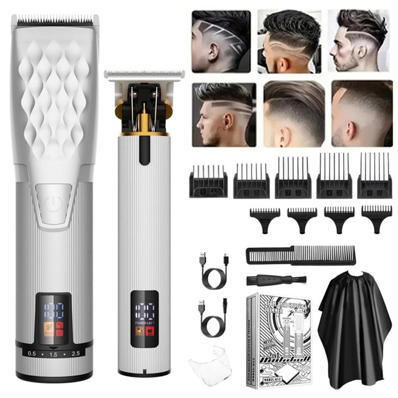 Product Includes: Professional Cordless Trimmer x 1, Carving Hair Shaver x1, Limit Comb Large (4/8/12/16/20mm), Limit Comb Small (1/2/3/4mm), USB Charging Cable x2, Comb x1, Brush x1, Transparent Protective x1, Surrounding Cloth x1.