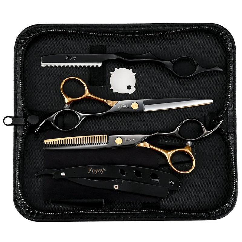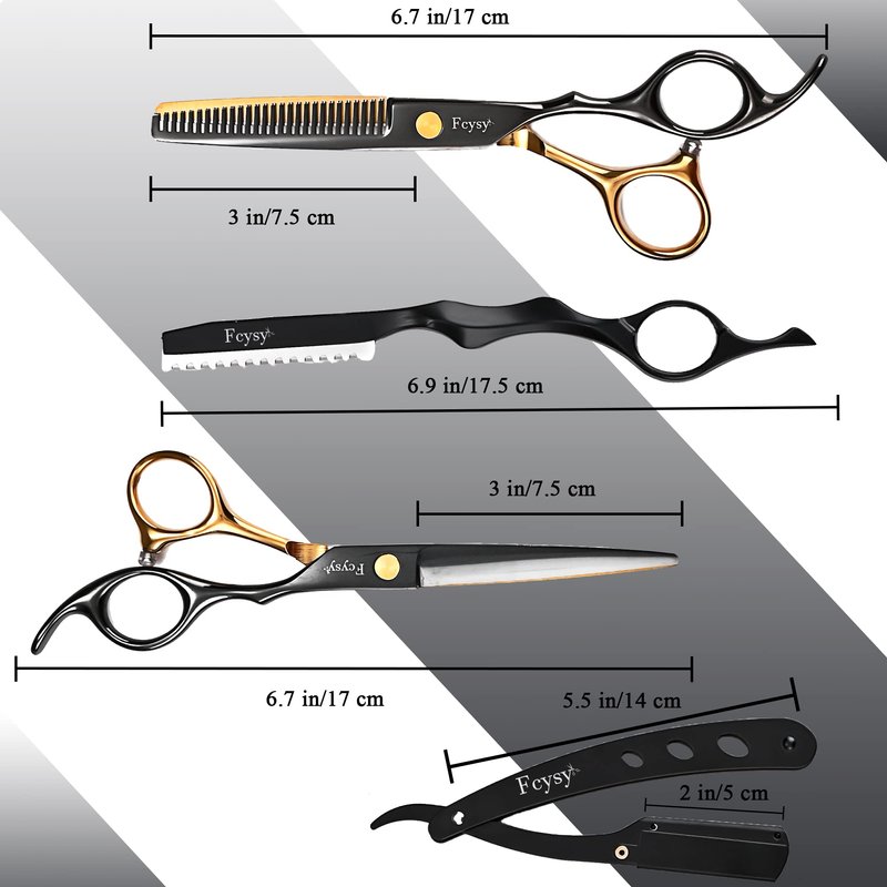 - 💇:PROFESSIONAL HAIR SHEARS SET: With a length of 6 inches, and safe smooth blade top design. Fcysy haircut scissors is safe and easy to use on men, women, the elderly, children, and dogs! With a sleek stainless-steel texture, our scissor reduces messy hair clutters as no hair gets caught in between its thinning blades, unlike other hair thinning scissors on the market.