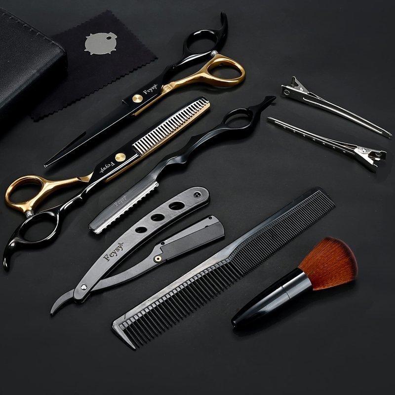 - 💇: ALL-IN-ONE HAIR CUTTING TOOLS: 1 x Hair Scissors,1 x Thinning Shear,1 x Hair Texturizing Cutting Razor, 1 x Straight Edge Razor (Blade Included), 1 x Cleaning Cloth, 1 x Comb, 2 x Hairpin, 1 x Neck Duster Brush, 1 x Hair Scissors Screw Adjustment, 1 x Leather Bag. The hair cutting kit meets all your hair cutting and styling needs.