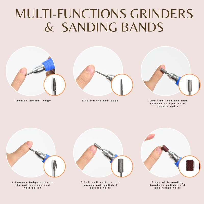 - Electric nail file kit with 6 replaceable drill bits and sanding bands to meet all needs for removing, dipping, polishing and shaping