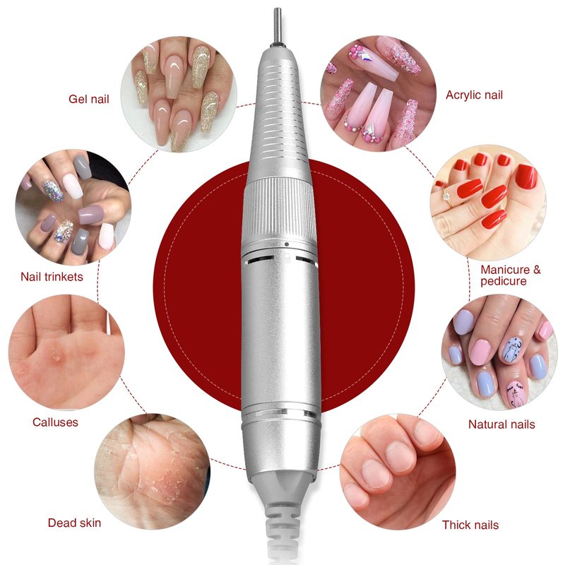 The newly designed LCD mini-type nail grinding machine, the LCD speed and battery are clear at a glance, so it will avoid the sudden power-off phenomenon during work; the appearance is exquisite, the ultra-bright aluminum metal body, the handle has its own switch, safe and convenient, LOW NOISE / SAFETY / HIGH SPEED, stable and shockless, it is definitely a great gift choice for yourself or your friends. This electric nail file can be used for manicuring, pedicuring, removing calluses, beautify pet's nail and so on, easy to remove all kinds of phototherapy nails, crystal armor, remove the nail piece fastly, suitable for professional nail technician or personal nail art or Manicure/pedicure using. ABOUT PRODUCT ADVANTAGES: ※ Professional imported ball bearings and a fast motor, ※ New Upgraded LED display: Could see that 0-30000rpm and 4 grid battery display, adjustable speed. ※ Professional imported ball bearings and a fast motor. ※ Low Heat: Great aluminum body and self-contained heat emission hole for efficient heat dissipation. ※ Quiet & Safe: Smooth operation and low vibration; Handle has a safety lock(lock the bit, safe and compact). ※ Fashion & Portable: wireless design and easy to move. ※ Support for output voltage 100-240V/50-60Hz, Available in multiple countries. ※ Easy to operate and specialized for carving, engraving, grinding, sharpening, sanding, polishing, drilling, to remove dead skin, to solve barbed etc, it also be used for grinding pet nails. SPECIFICATIONS: Input Voltage Range: AC100-240V/50-60Hz Output Voltage DC24V 1A Battery capacity: 2000mA(11.1V) Charging Time: About 2 houes Battery life at full speed: 10 hours Speed: MAX 30000RPM WHAT'S IN BOX: 1 x electric nail drill 1 x handpiece seat 1 x AC adaptor 1 x handpiece holder 6 x drill bits 1 x user manual