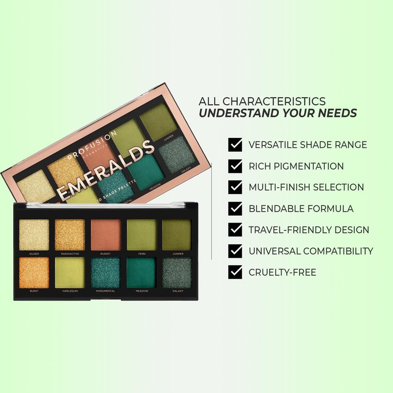 Profusion Cosmetics 10-Shade Emeralds Eyeshadow Palette, Versatile Looks with Travel-Friendly and Richly Pigmented Blendable Multi-Finish Shades, Suitable for All Skin Tones and Cruelty Free