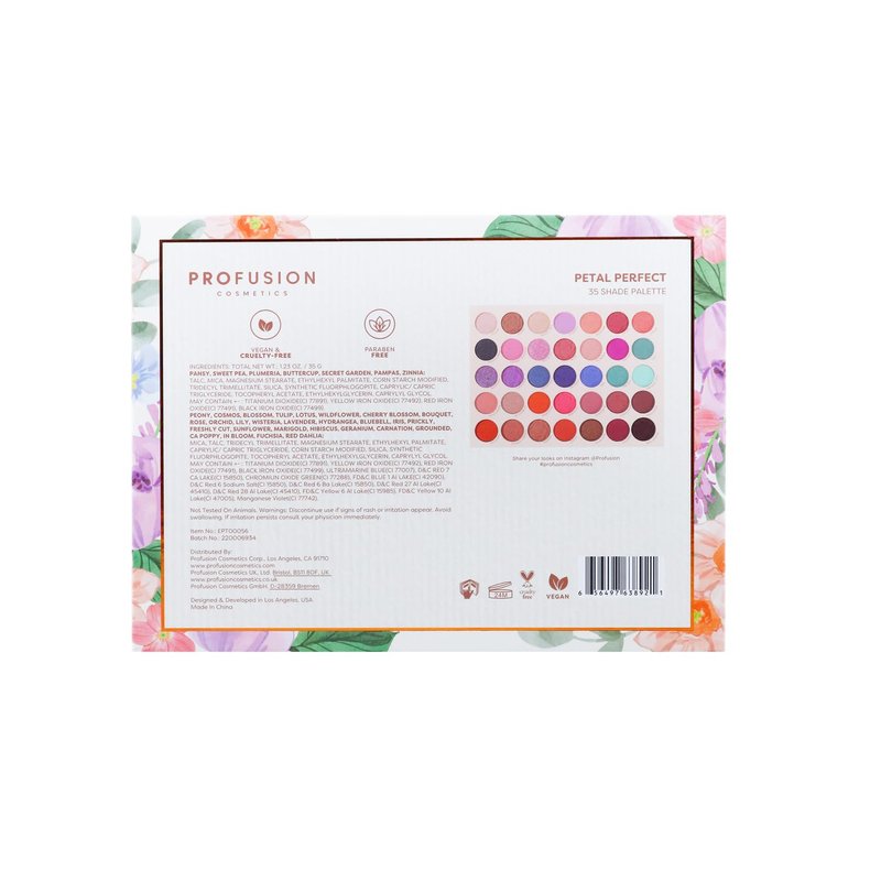 The Profusion Cosmetic Petal Perfect 35 Shade Eyeshadow Palette is the ideal choice for creating any look, from natural daytime makeup to bold, glamorous styles. With 35 beautiful shades in matte, shimmer, satin, and metallic finishes, you can easily mix and match to find the flawless color combination. The richly pigmented and smooth formula makes it easy to apply and blend, ensuring a flawless finish every time. Plus, it's enriched with Vitamin E to care for your skin, and it's vegan and cruelty-free, so you can feel good about using it. Whether you're just starting with makeup or you're an expert, this palette has everything you need to let your creativity shine.