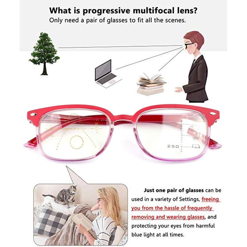 - PROGRESSIVE MULTIFOCUS BLUE LIGHT FILTER READING GLASSES - Progressive multifocal blue light blocking reading glasses can help middle-aged and elderly people get better visual experience. Anti blue light & UV400 lenses help you resist 100% harmful blue light & reflective & UVA/UVB rays, help you reduce glare headache eyestrain. Whether you are reading, using computer or looking at a distance. A pair of glasses to solve all your needs!