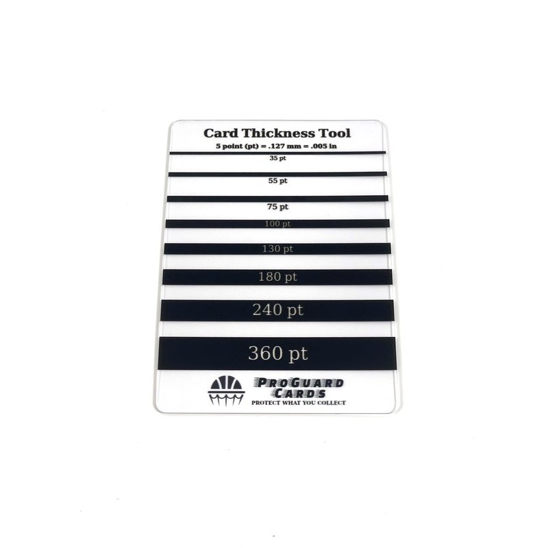 ProGuard Cards Trading & Sports Card Thickness Guage Tool Guide. Leave the guessing out of it. Clear material for easy use. Durable plastic that lasts. Fits in standard penny sleeves for storing and protecting.