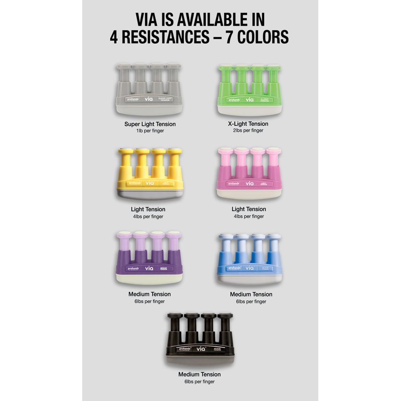 - VARIOUS TENSION LEVELS: Graduated tension levels help the user measure progress. VIA 1lb to 6lb, GRIPMASTER 1lb to 9lb, GRIPMASTER-Rehab 0.75lb to 9lb, PRO 5lb to 13lb. By isolating each digit, stronger fingers can’t compensate for the weaker ones.