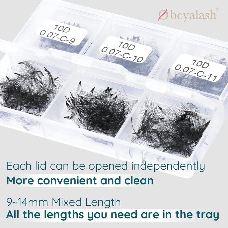 Obeyalash offer promade fans in 3D~11D 0.07mm thickness C/D curl 8mm~17mm length. You can use Obeya Promade fans to create every lash style. Your clients can get great results with different lengths. Obeya Promade lash fans handcrafted by skilled lash artist, lash fans are symmetrical and evenly spaced. Tiny adhesive bases are used for best bonding results, very lightweight. The Loose Fans Lash Extensions offer a much more genuine lasting experience and look. Promade Fans Lashes come in a box of 1,000 fans (only 3.5 cents per fan). 1000 (+1%) loose fans, the amount is correct. 8.3 times the amount of normal 12 rows lash trays. That's enough to serve 6-9 clients. This lash tray offers unbeatable value for the price. 8mm~17mm mixed length in one tray, a lot more cost effective than having to buy each length separately. Loose fans lash extensions are easier to use while working compared to normal tape lash trays. You can quickly pick up and apply eyelash fans with tweezers,the Promade fans are not attached to the tape, the premade fans won’t fall apart, moreover eyelashes are clean without residue.
