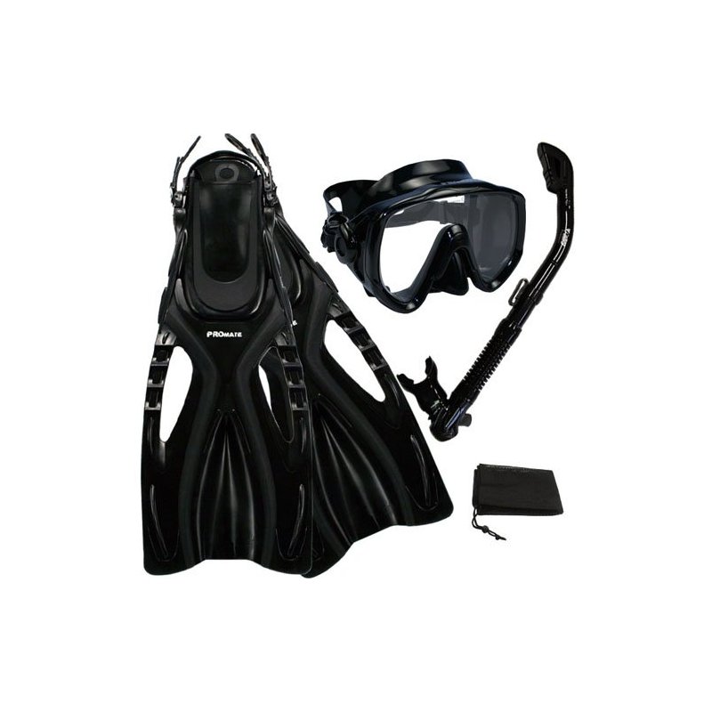 Promate Scuba Diving Snorkeling Extra-Wide Mask Snorkel Fins Gear Set, AllBlack, S/M
