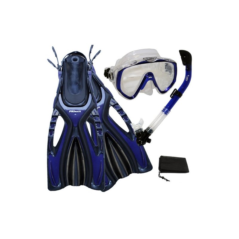 Promate Scuba Diving Snorkeling Extra-Wide Mask Snorkel Fins Gear Set, Blue, S/M