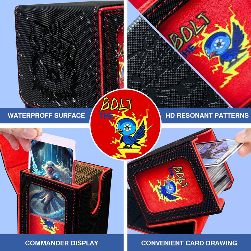 - Stunning Visual Design: Experience the artistry of the PROMAXIBINDER MTG deck box, inspired by the iconic Bolt the Birds. The redesigned cover offers a fresh and captivating look that will leave a lasting impression on all players. Innovative window design is perfect for EDH Commander players and versatile enough for Prime cards like Energy cards. The custom slots securely hold your Commander or Prime card in the included top loader for easy identification and display. The MTG deck box can also prop itself up with its lid for convenient access.